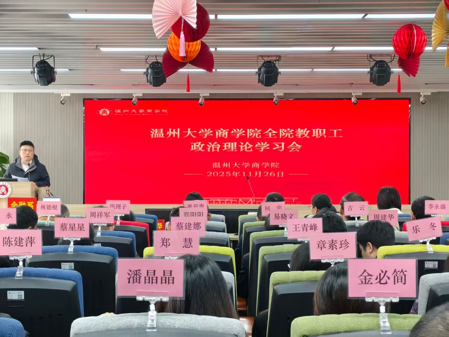 2025年11月26日下午,商学院在商院楼A226仲辉商道讲堂举行全院教职工政治理论学习会,会议由学院党委书记唐华主持,学院全体教职工参加。