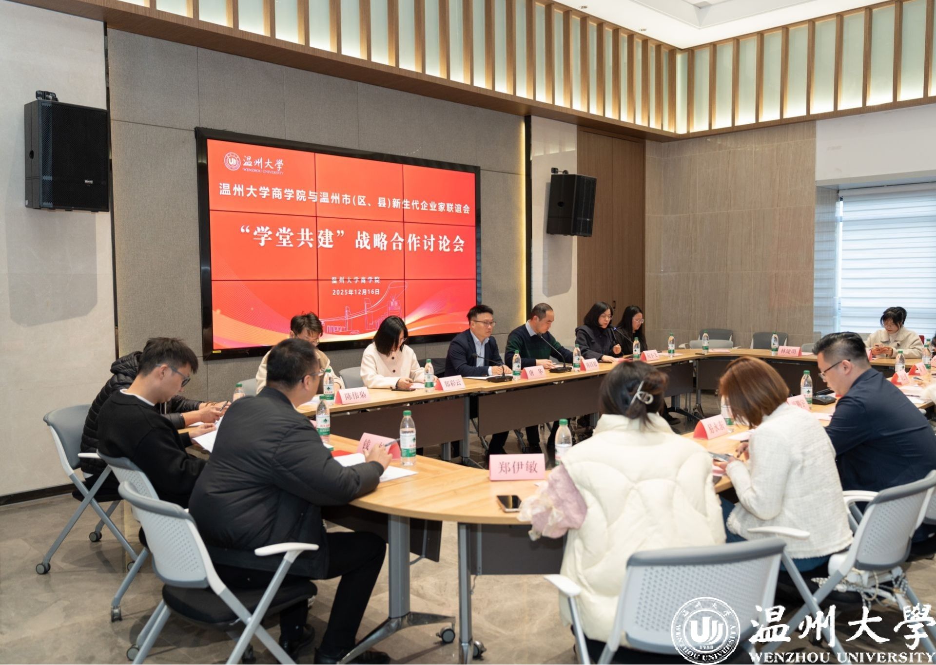 2025年12月16日下午,温州大学商学院与温州市(区、县)新生代企业家联谊会在温州大学联合举办校企合作“学堂共建”战略合作研讨会。商学院党委书记唐华、培训中心执行主任陈昌旭,温州市新生代企业家联谊会办公室主任董冬,以及来自全市11个县(市、区)新生代企业家联谊会的会长、秘书长等核心成员出席会议。