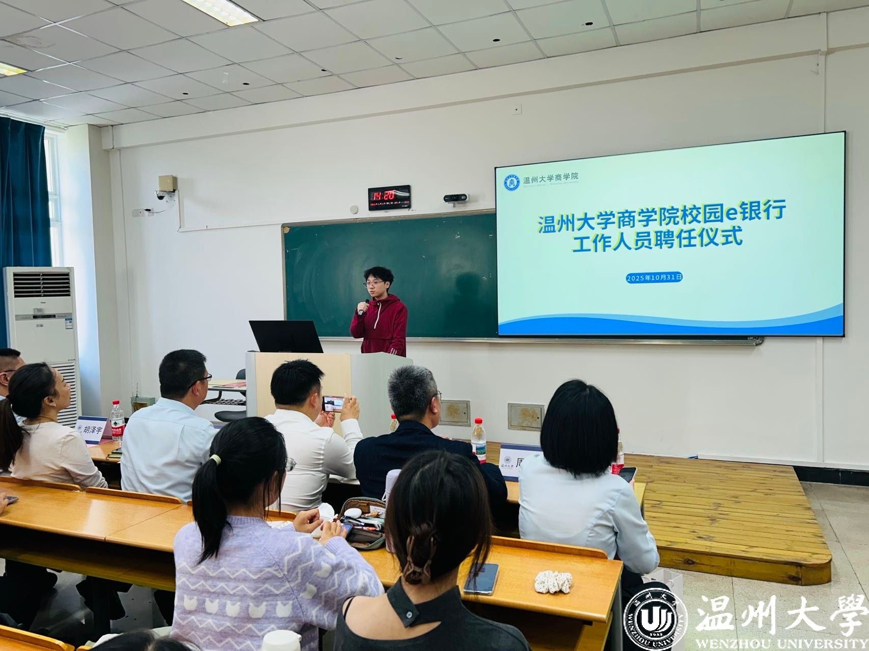 中国教育在线浙江站讯 (编辑 占尘雪 通讯员 周洁文)在温州大学商学院,一群在校生不仅接触金融理论,更提前“上岗”成为银行行长和客户经理。10月31日,温州大学商学院校园e银行新一届工作人员聘任仪式在北校区2-401教室举行。此次仪式融入2025级金融工程专业导论课堂,以“实践育人”为核心,生动展现了学院“银校共建”党建品牌的深化成果。