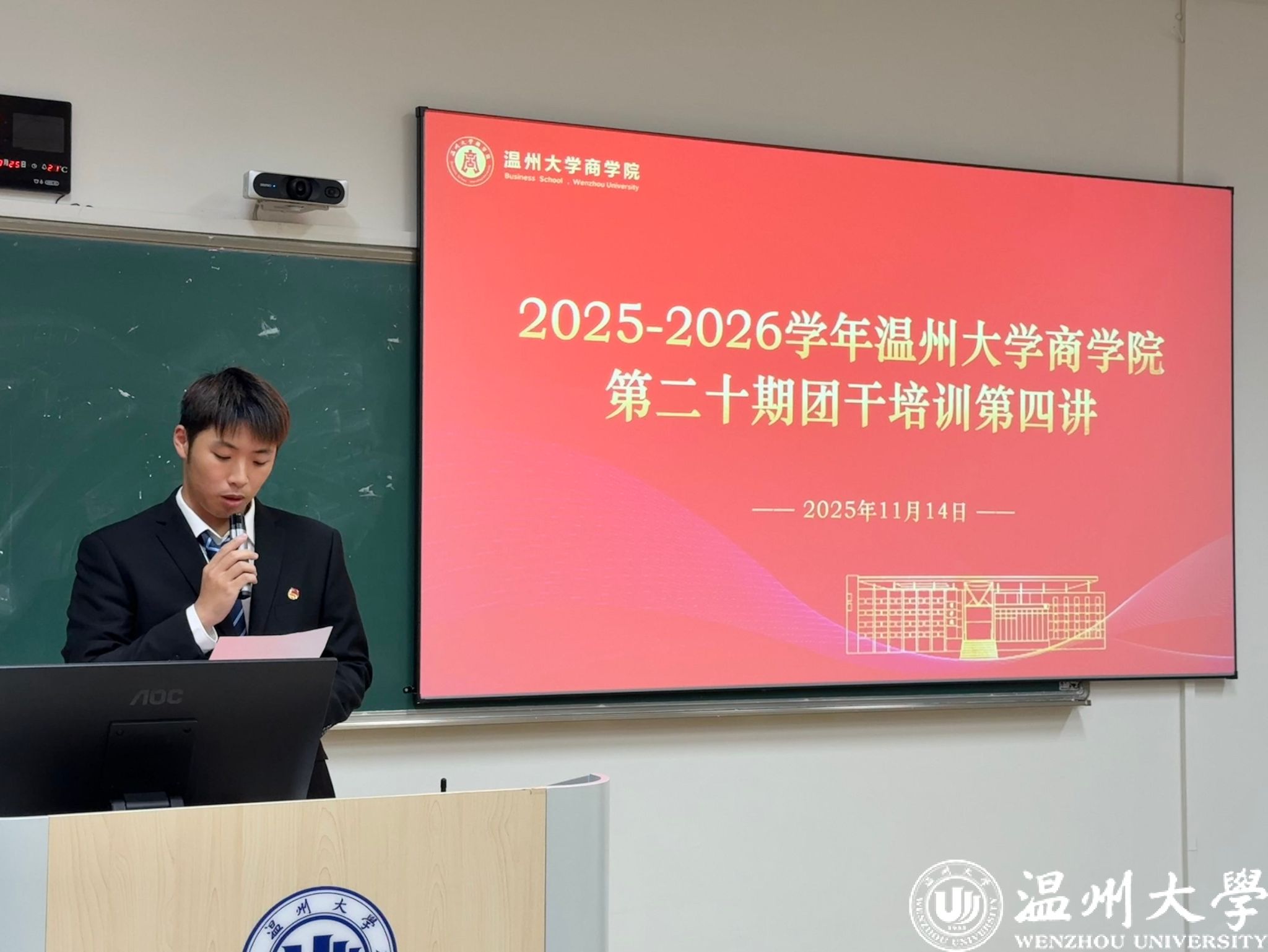 为引导团学干部们深刻领悟共青团的使命担当,将个人成长融入团队发展,更高效稳定地推动商学院团委学生会工作开展,2025年11月14日晚,商学院开展第二十期团干培训第四讲。本次培训以“当青春与共青团相遇,让‘我’变成更多‘我们’”为主题,由温州大学校团委的韩新华老师担任主讲嘉宾,商学院团委学生会各部门干事参加本次会议,会议由组织部干事安帅主持。