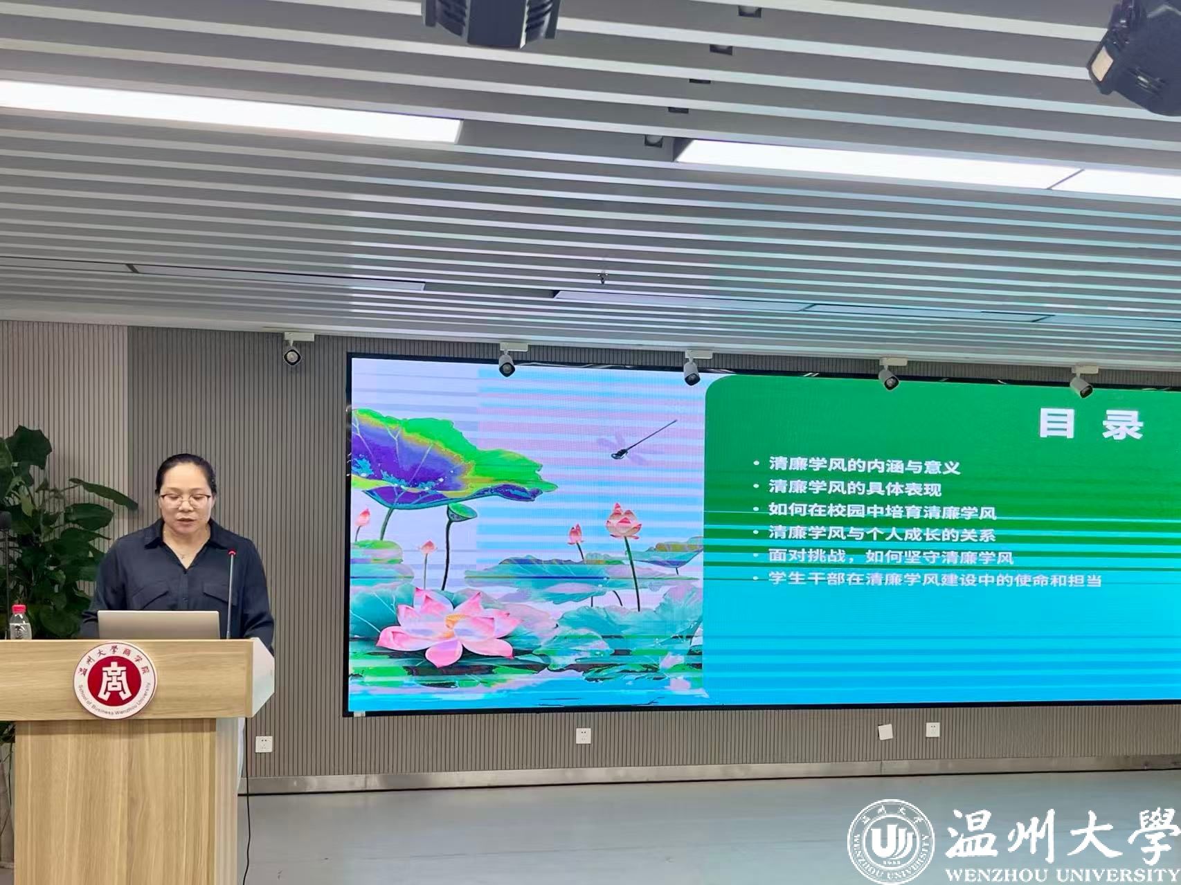 为深入推进校园清廉文化建设,引导学院团学干部筑牢廉洁自律思想防线,2025年10月24日晚,商学院开展第二十期团干培训第一讲。商学院党委副书记、纪委书记曾蓓蕾以“清廉学风,青春力量”为主题,为团学干部专题授课。
