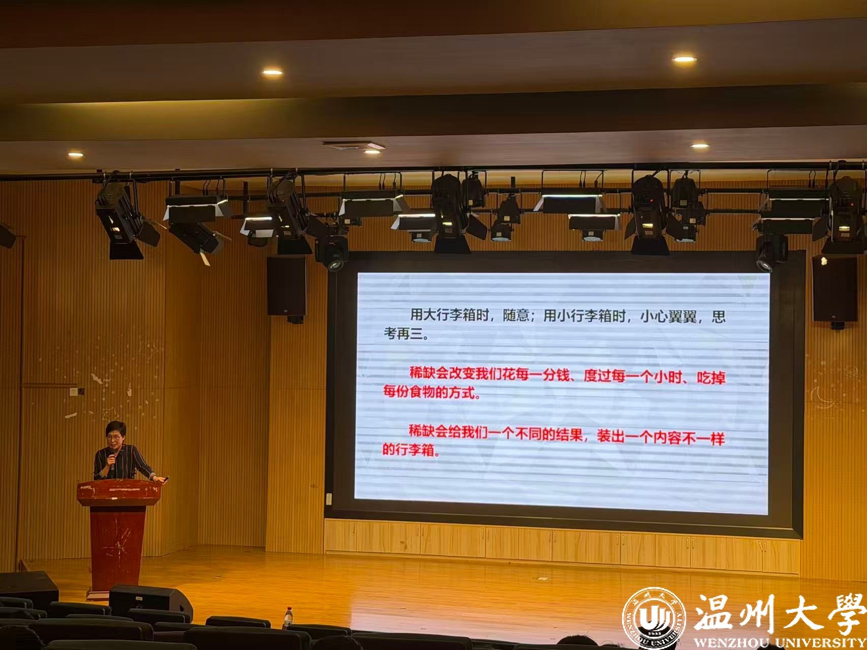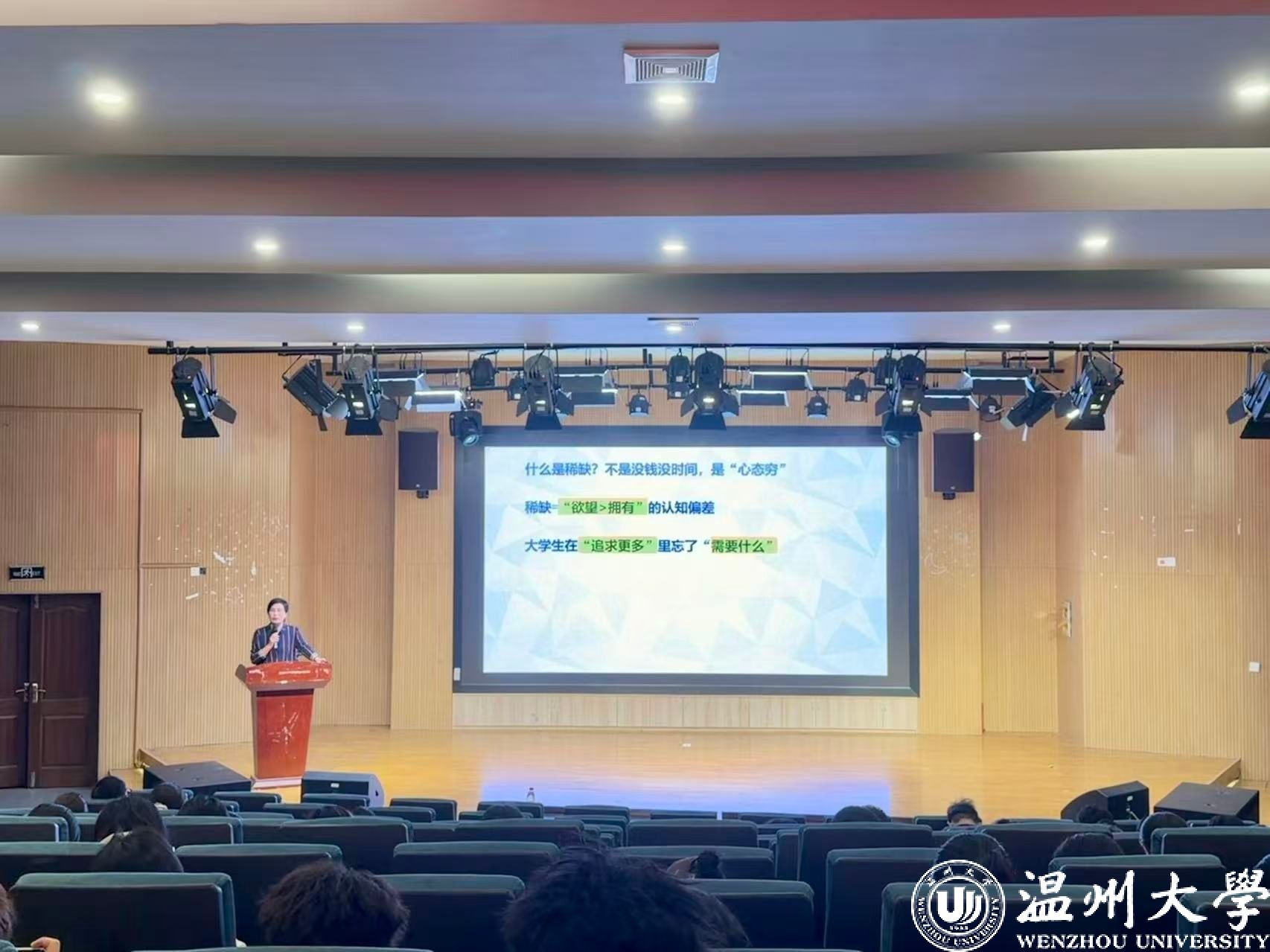 2025年11月14日晚,温州大学商学院在北4-114报告厅为 2025 级本科生带来主题为“从稀缺到富足”的心理幸福课讲座。本次讲座由温州大学人事处处长郑彩莲主讲,旨在帮助新生破解大学阶段常见的时间、财富、交往等稀缺困境,建立富足心态。